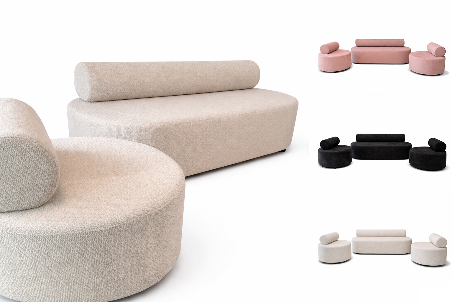 Sculptural curves and soft upholstery come together in a modern modular lounge, blending comfort with minimalist elegance in blush, charcoal, and sand tones.