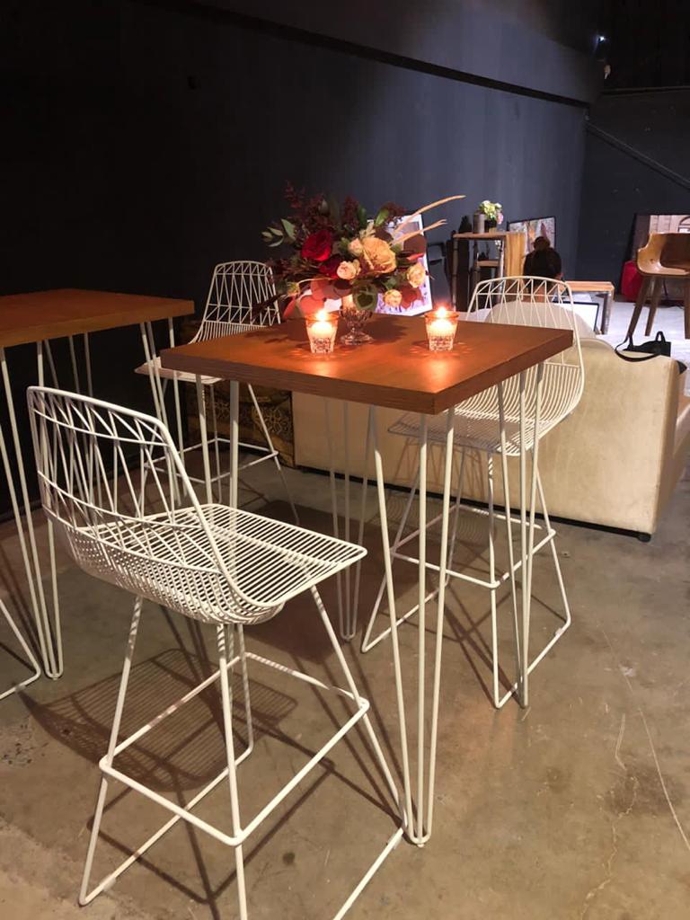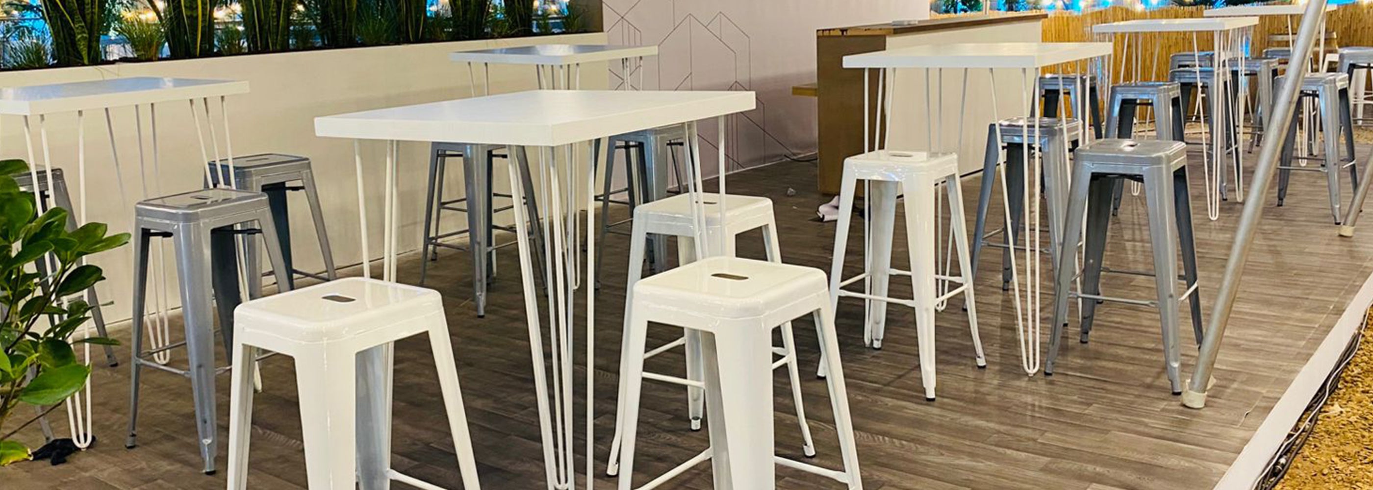 Make a statement at your event with our elegant hairpin leg white tables adorned with stunning whitewash table tops.